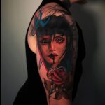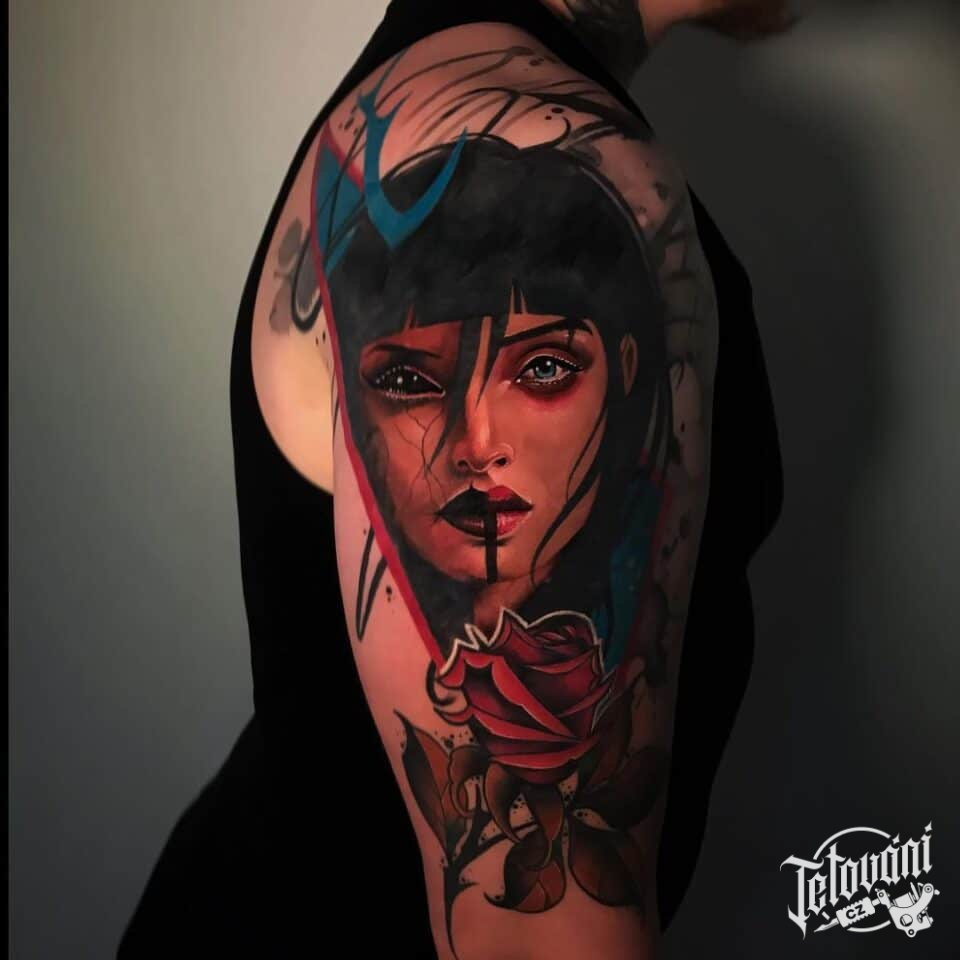 Tetování portrét ženy, květina růže na rameno