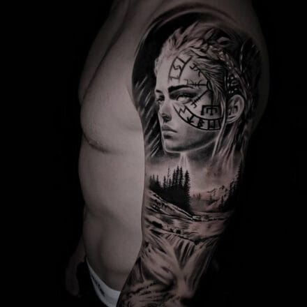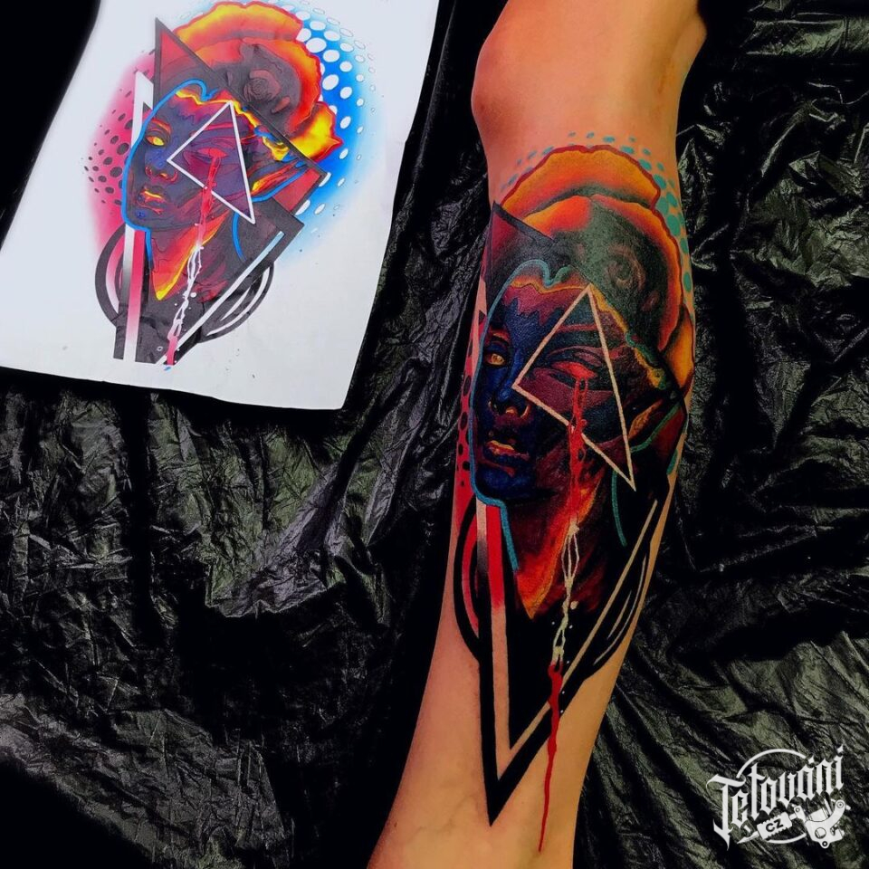 Tetování portrét ženy, květina růže, tvary na lýtko