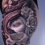 Tetování portrét ženy, květiny a zvířata, had a motýl na boku stehna