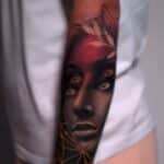 Tetování portrét ženy, květiny, hvězdy na předloktí