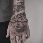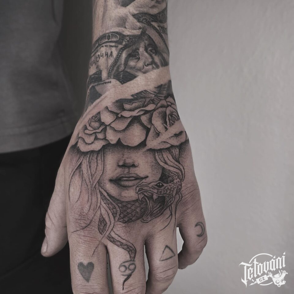 Tetování portrét ženy, květiny růže, zvíře had na hřbet ruky
