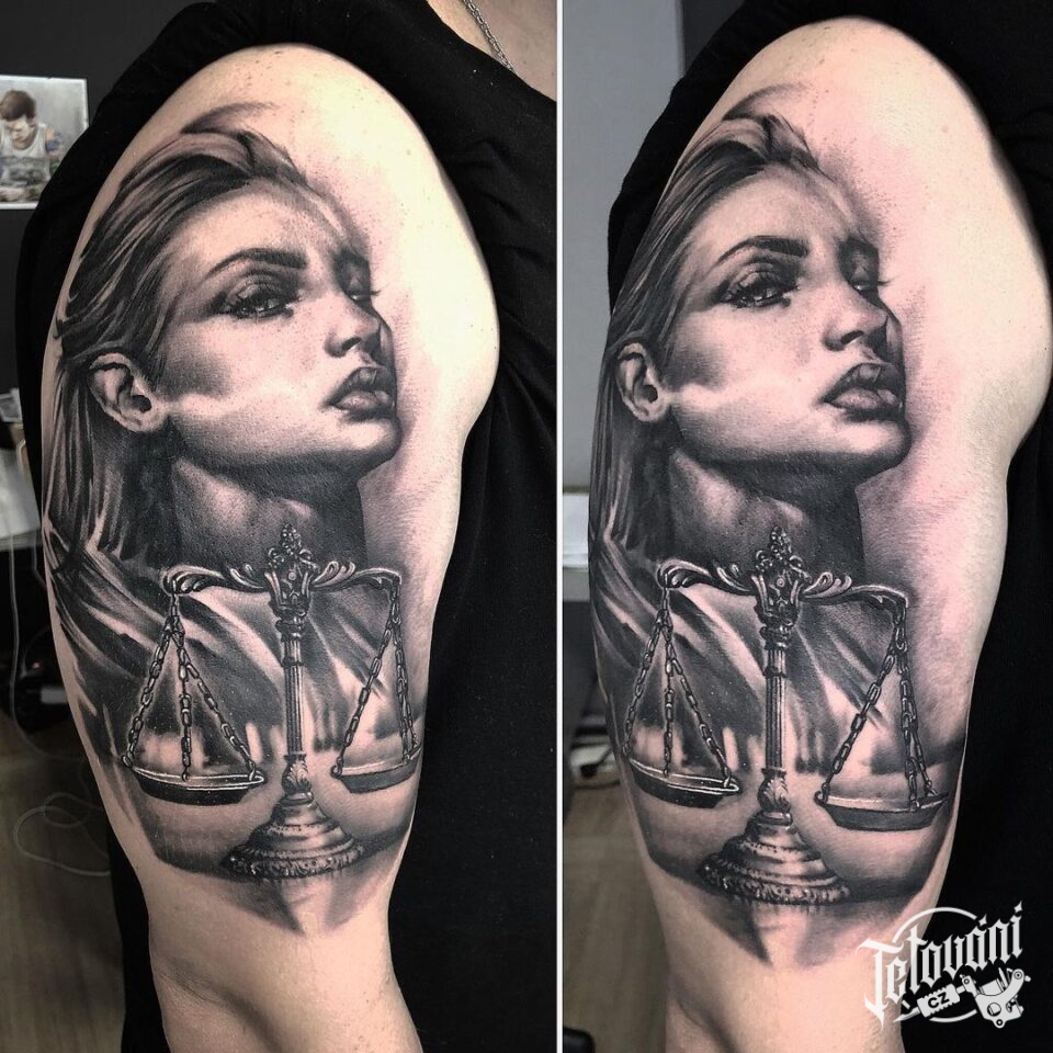 Tetování portrét ženy, lady Justice, Váhy na rameni