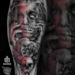 Tetování portrét ženy, lebka a růže na lýtku