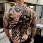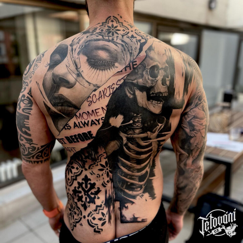 Tetování portrét ženy, lebka, kostlivec, nápisy, ornamenty na zádech
