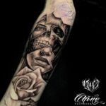 Tetování portrét ženy, lebka, lebka a růže na rameno