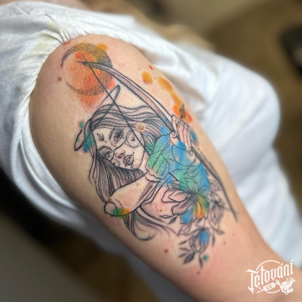 Tetování portrét ženy, lučištnice na paži