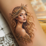 Tetování portrét ženy, malba dívky od Alfonse Muchy na předloktí