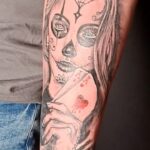 Tetování portrét ženy muerte, karty, esa na předloktí