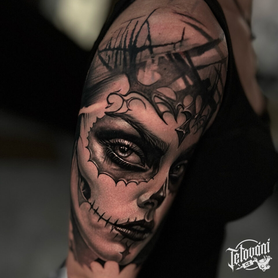 Tetování portrét ženy muerte na rameni