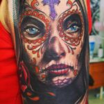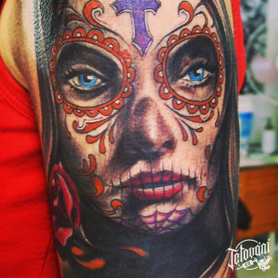 Tetování portrét ženy muerte na rameni
