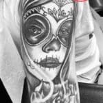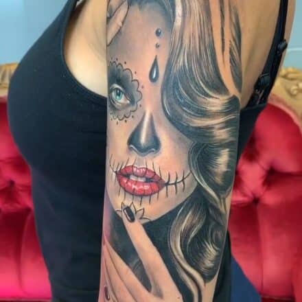 Tetování portrét ženy muerte na rameni