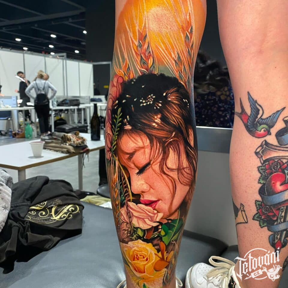 Tetování portrét ženy na lýtku