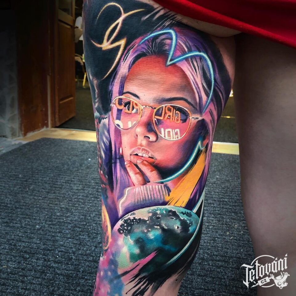 Tetování portrét ženy na stehně