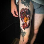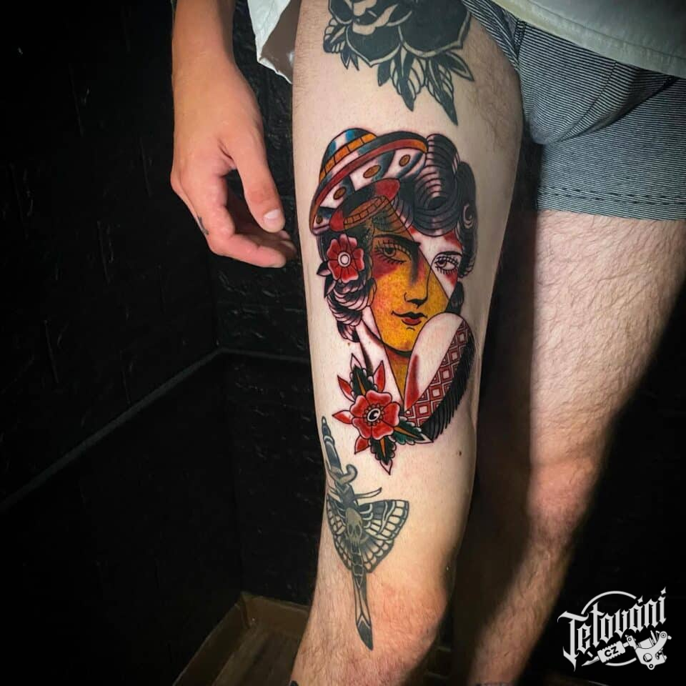 Tetování portrét ženy na stehně