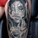 Tetování portrét ženy na stehně