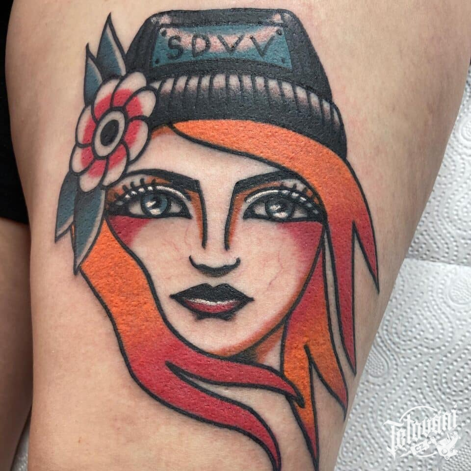 Tetování portrét ženy na stehně