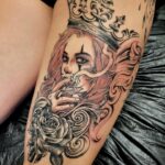 Tetování portrét ženy na stehně