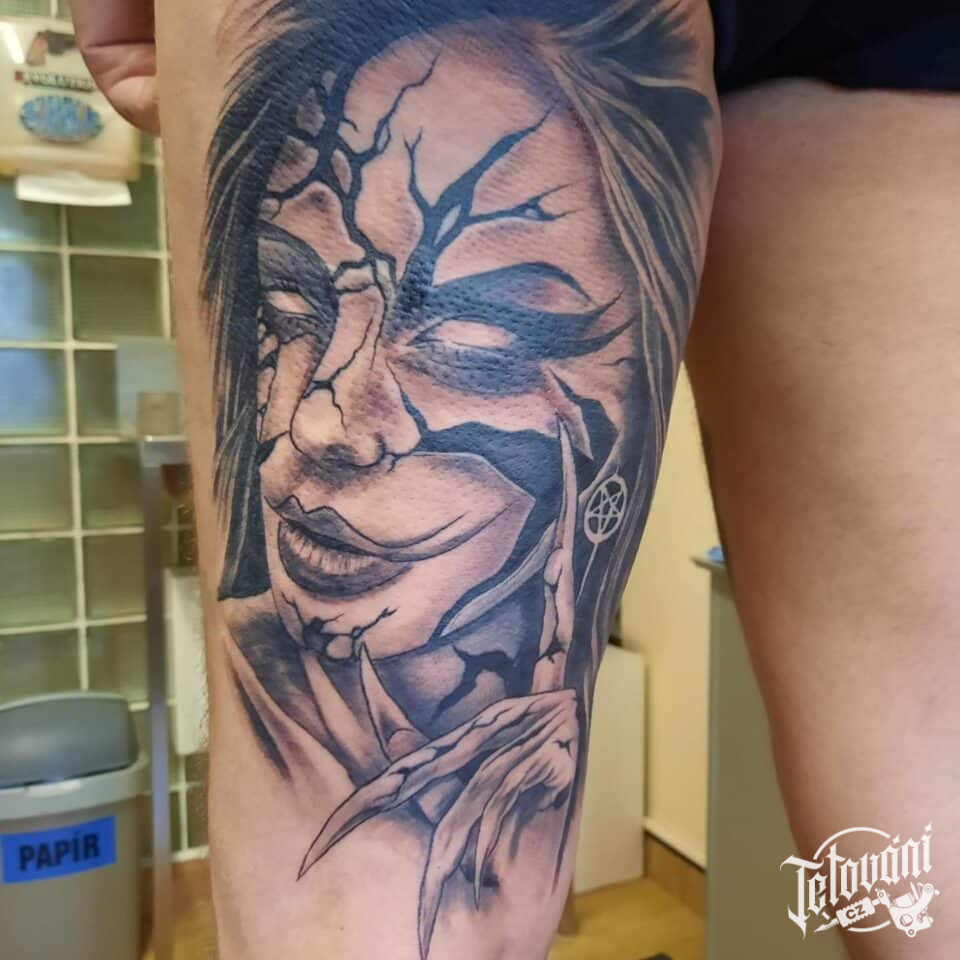 Tetování portrét ženy na stehně