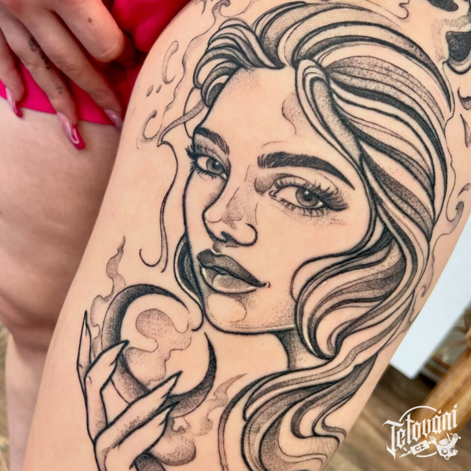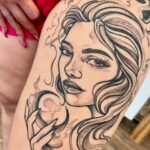 Tetování portrét ženy, vodnář znamení zvěrokruhu na stehně