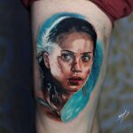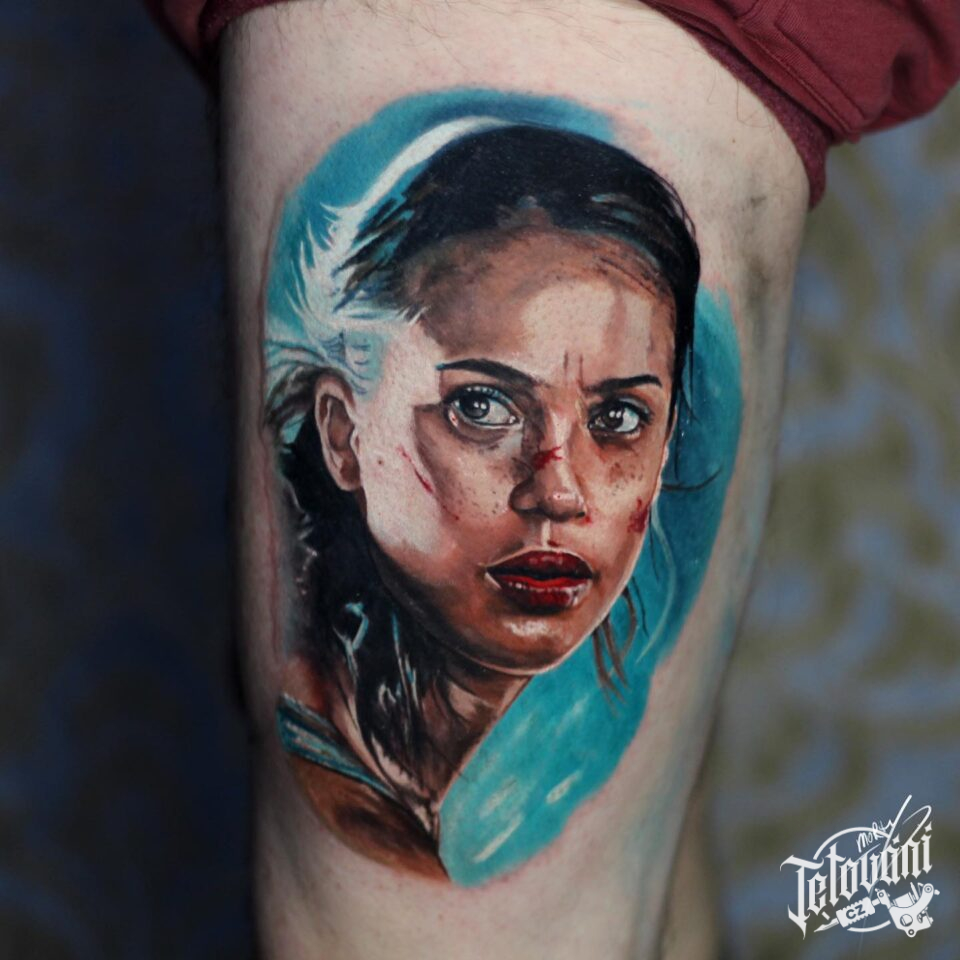 Tetování portrét ženy na stehno