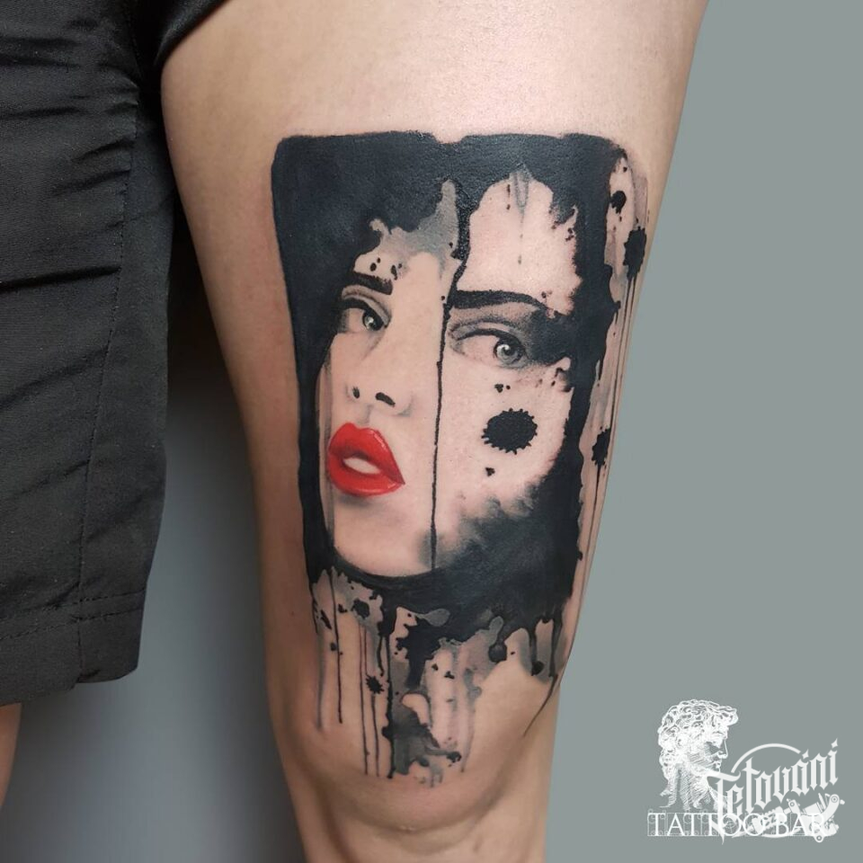 Tetování portrét ženy na stehnu