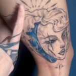 Tetování portrét ženy na stehnu