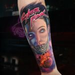 Tetování portrét ženy, nápisy, vesmír a planeta na předloktí