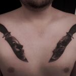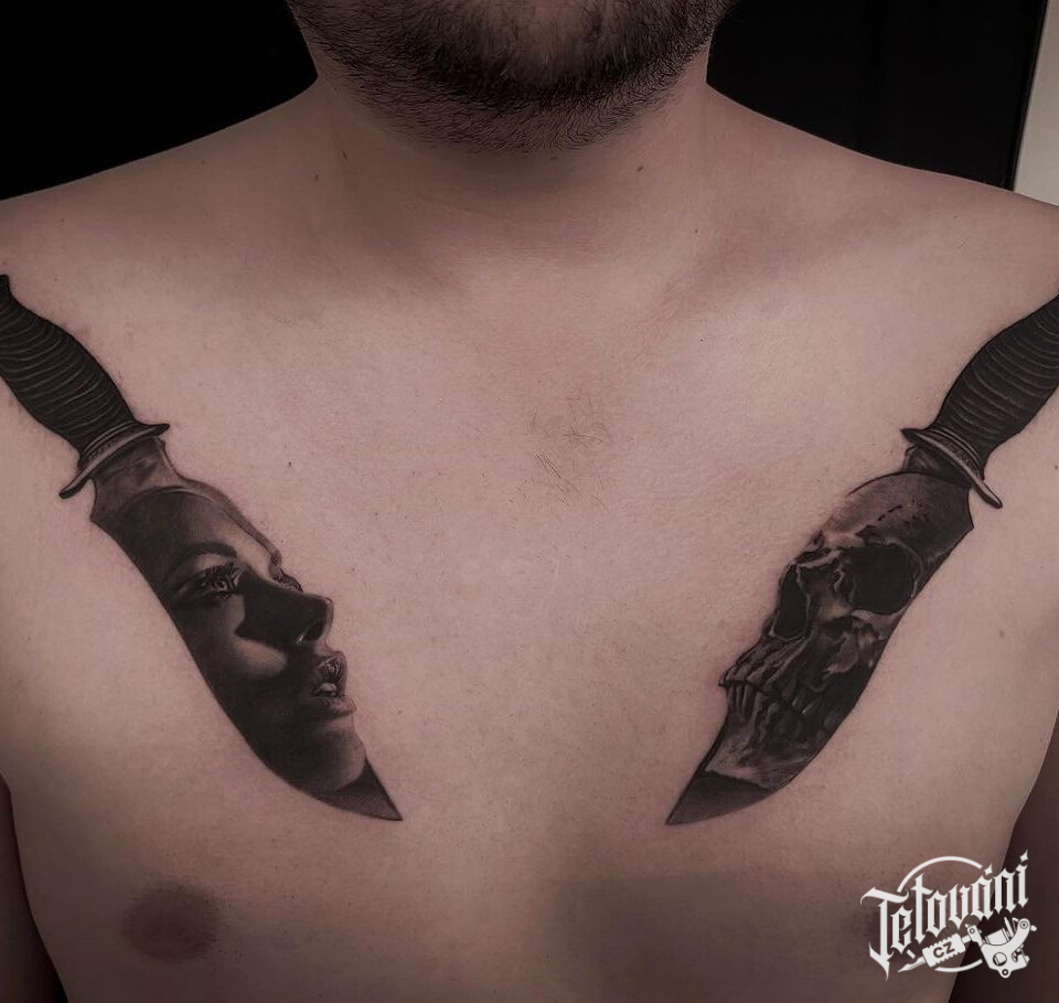 Tetování portrét ženy, lebka, nože na hrudi