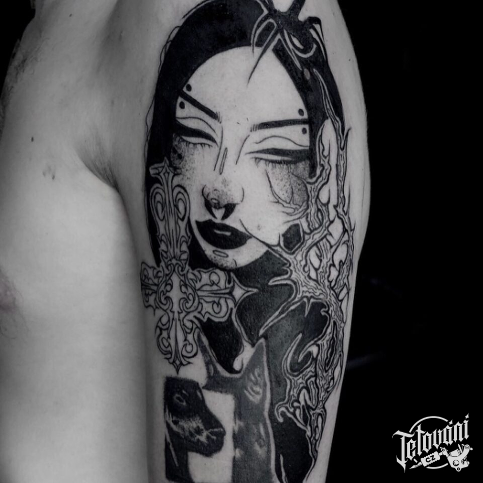 Tetování portrét ženy, obrácený kříž, pavouk na rameni
