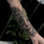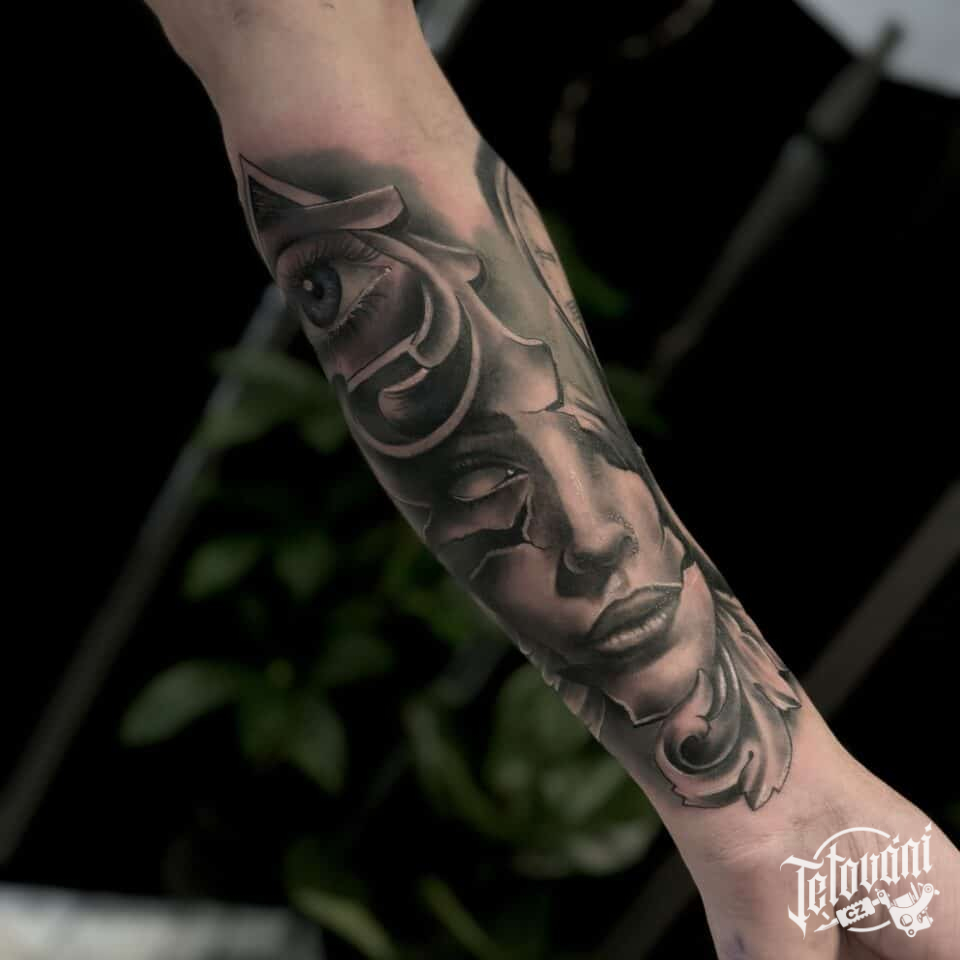 Tetování portrét ženy, oko a ornamenty na předloktí
