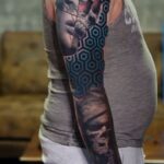 Tetování portrét ženy, ornamenty, lebka, rukáv