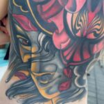 Tetování portrét ženy, ornamenty, mýtické bytosti, drak na zádech a boku