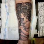 Tetování portrét ženy, ornamenty, tvary na předloktí
