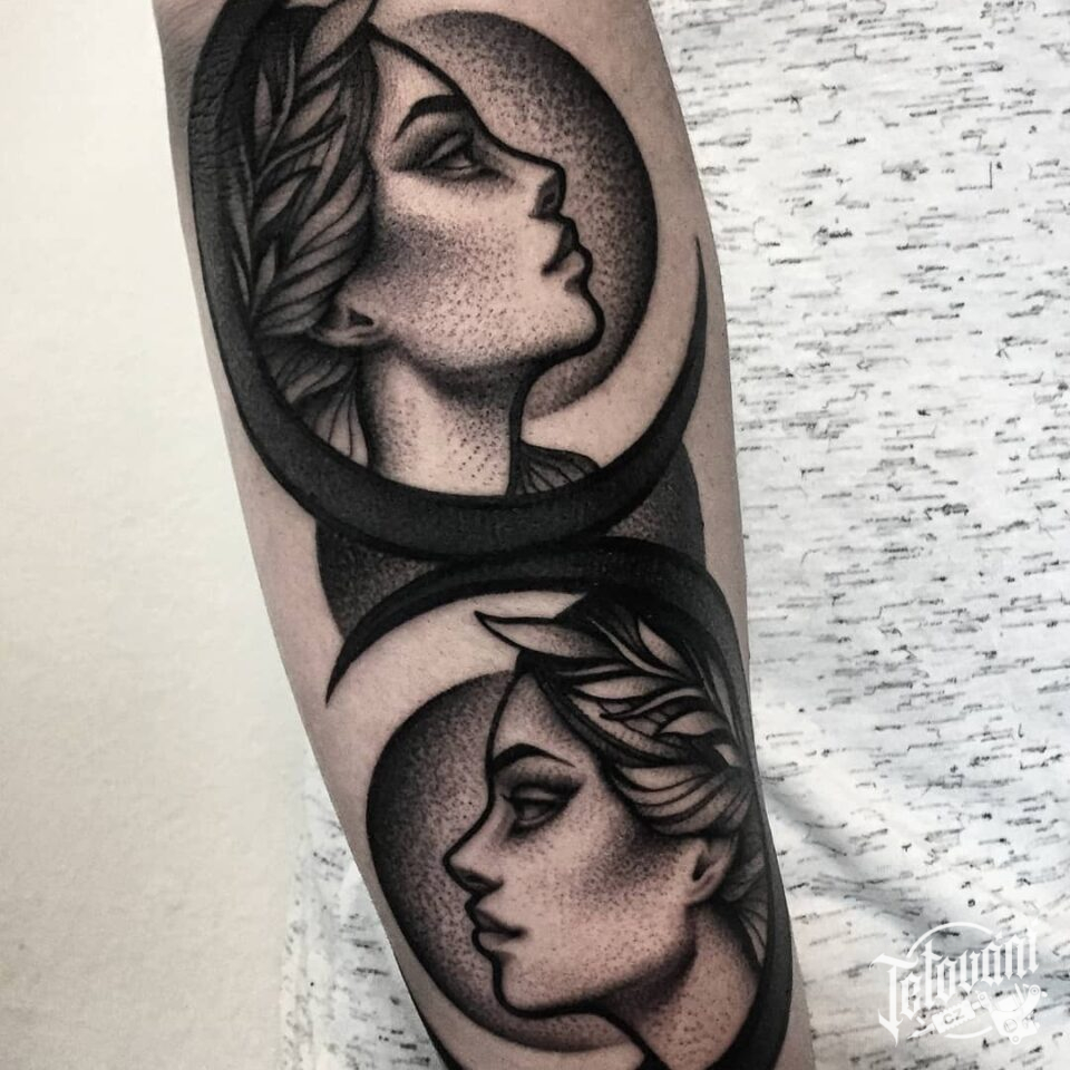 Tetování portrét ženy, planety slunce a měsíc na předloktí