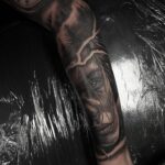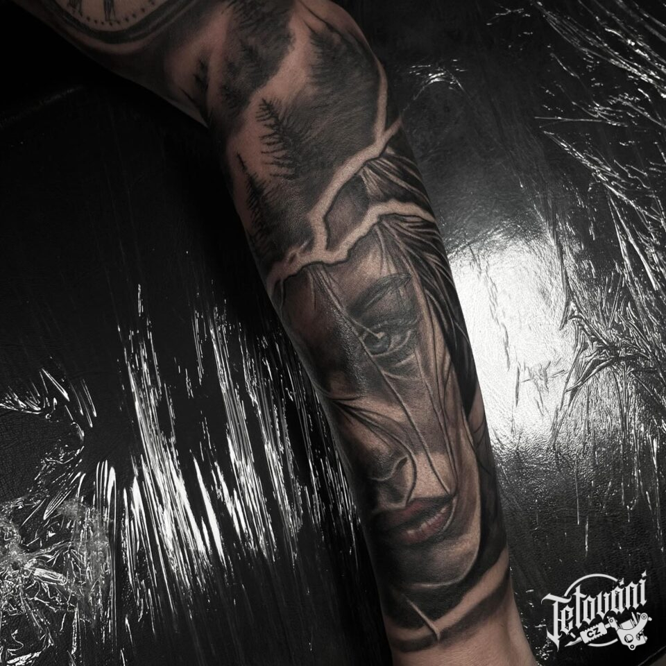 Tetování portrét ženy, příroda les na předloktí