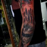 Tetování portrét ženy, příroda les na rameno a předloktí