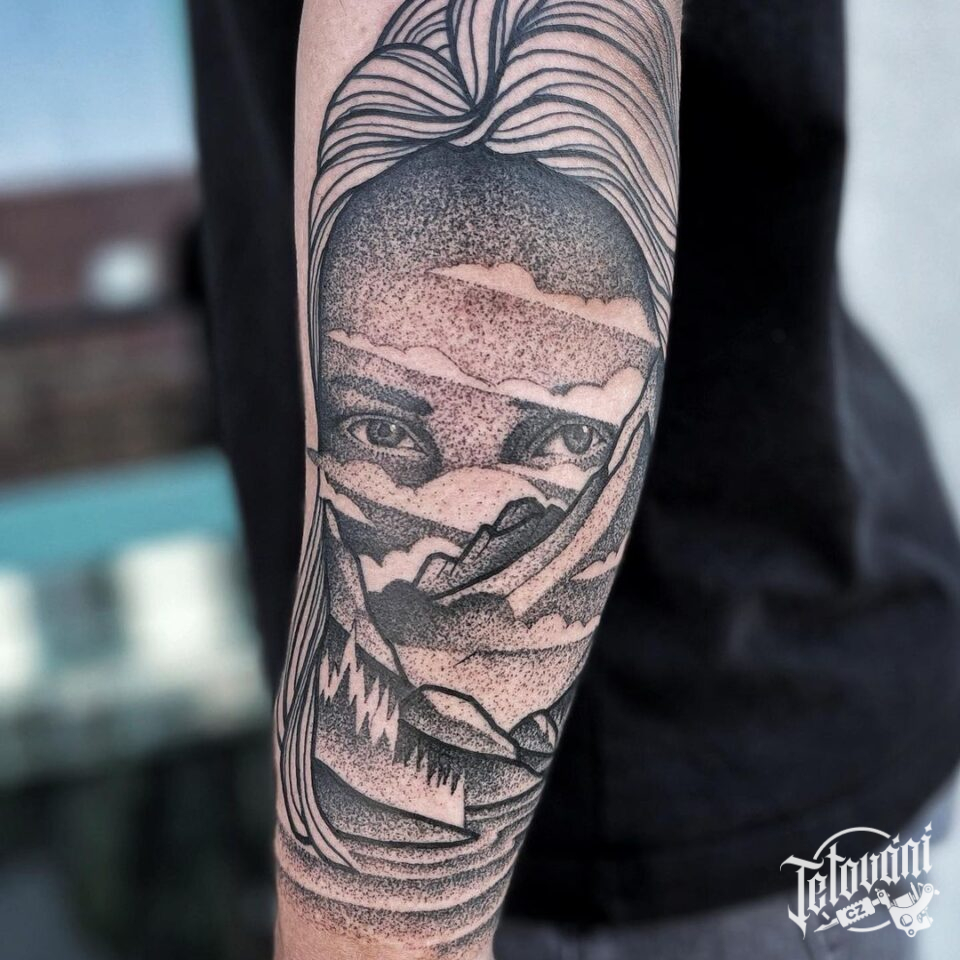 Tetování portrét ženy, příroda na předloktí