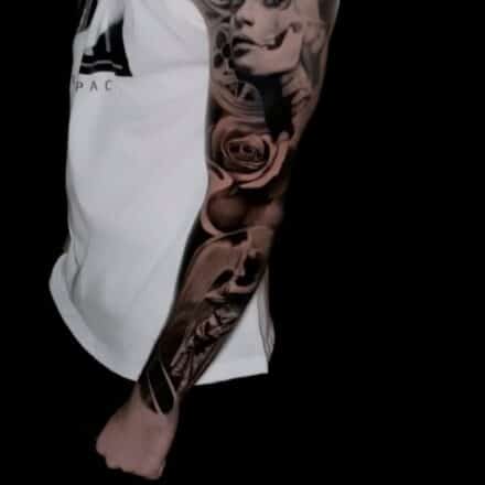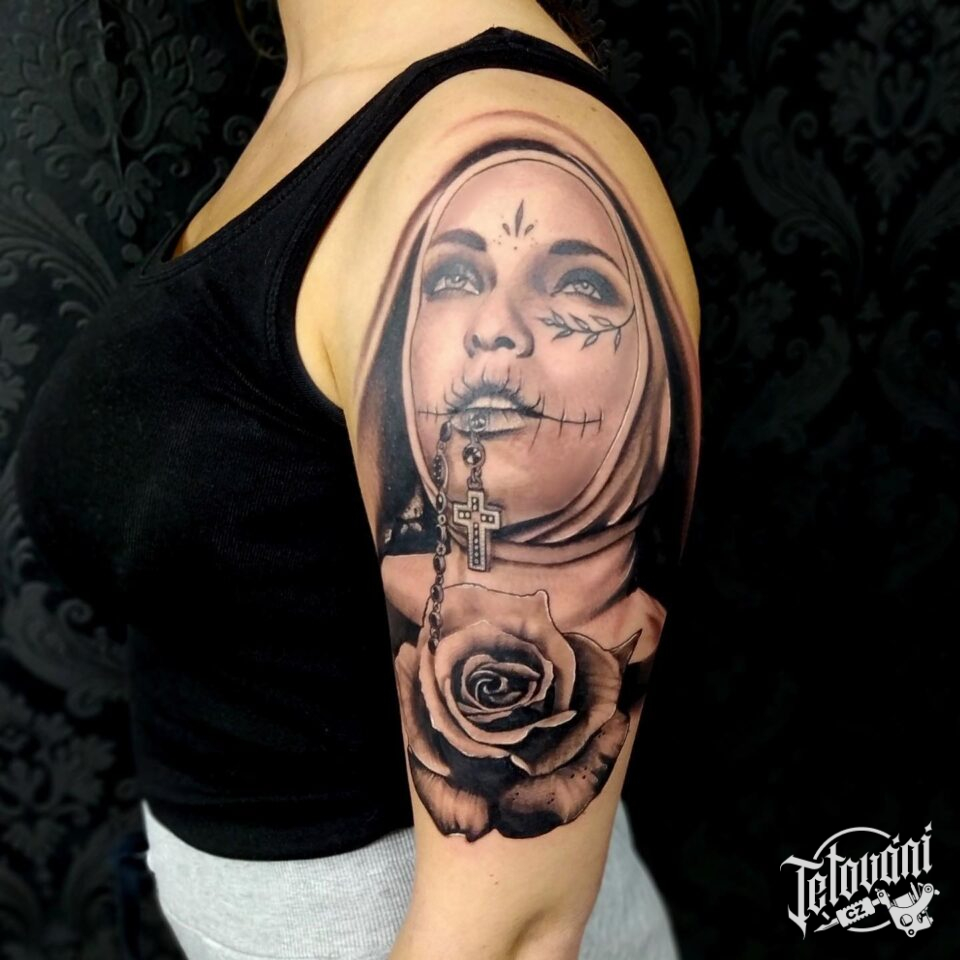 Tetování portrét ženy, řádové sestry a květina, růže na rameno