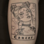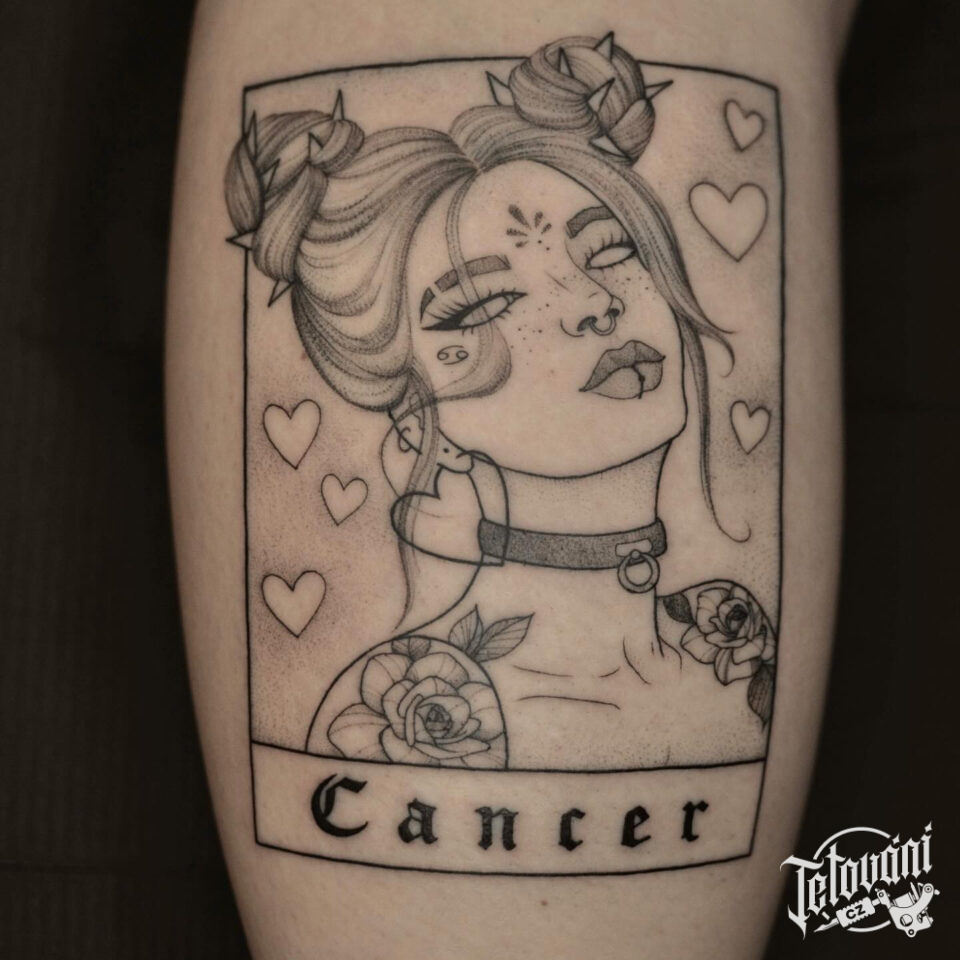 Tetování portrét ženy, rak znamení zvěrokruhu na lýtku