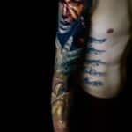 Tetování portrét ženy, ruce, lebka, rukáv