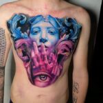 Tetování portrét ženy, ruka, oko na hrudi