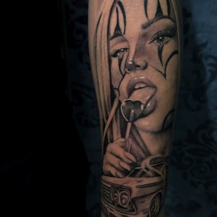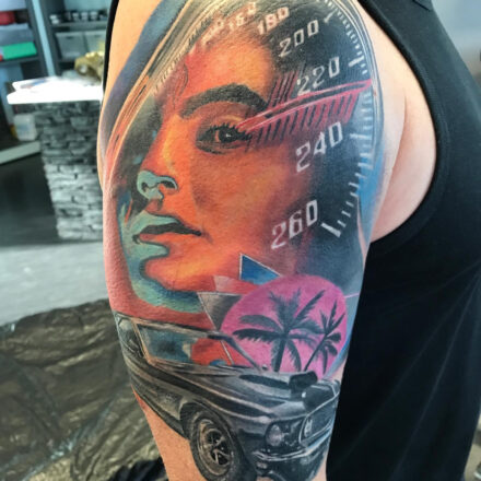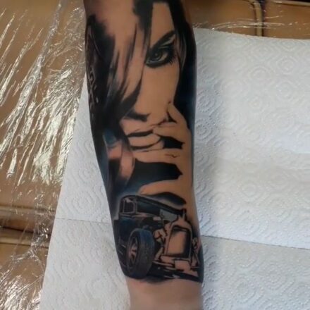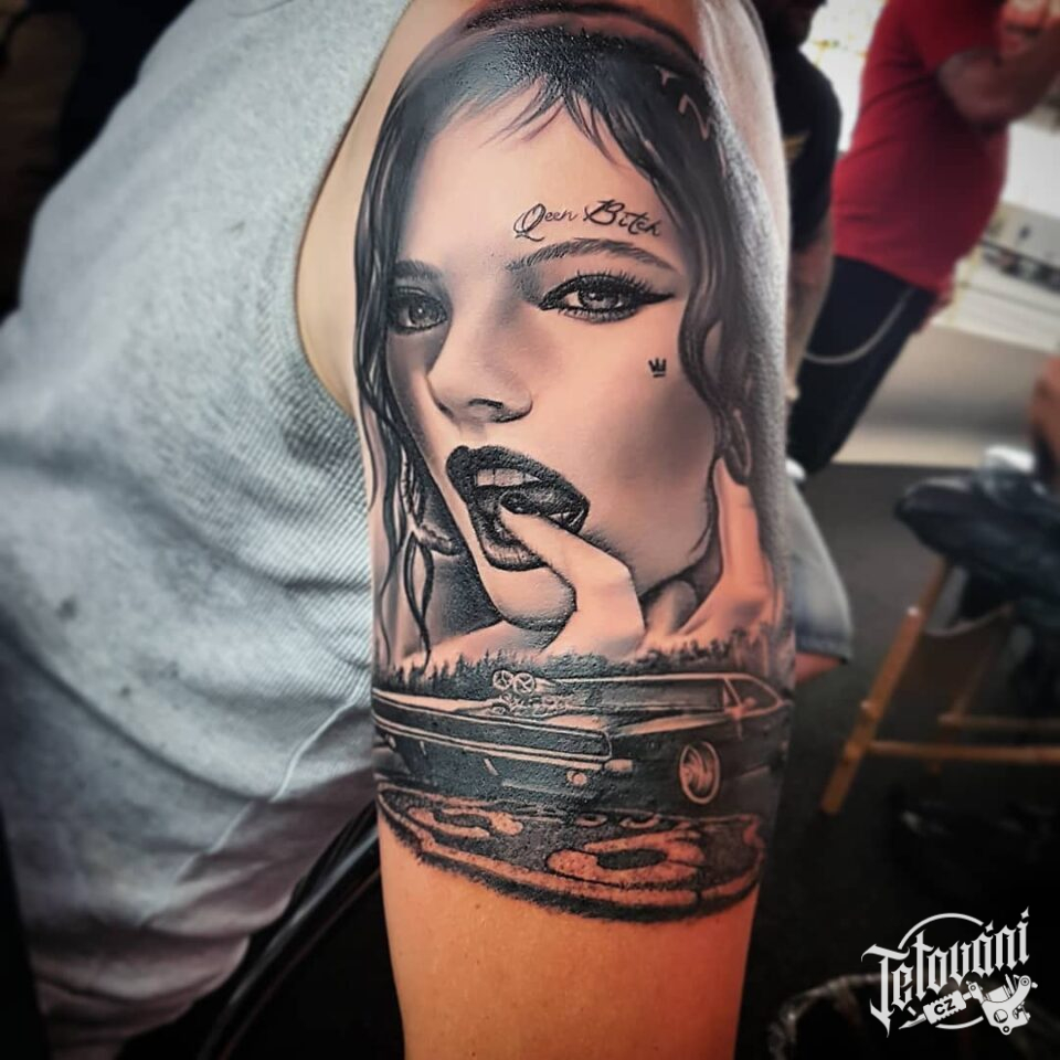 Tetování portrét ženy s autem na rameni