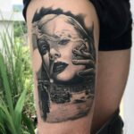 Tetování portrét ženy s cigaretou v ruce na stehně