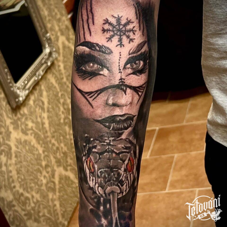 Tetování portrét ženy s hadem na předloktí