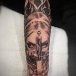 Tetování portrét ženy s křížem, náboženství na předloktí