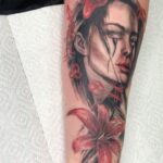 Tetování portrét ženy s květinami a znamení zvěrokruhu na rameni