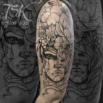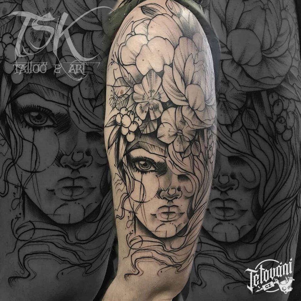 Tetování portrét ženy s květinami na rameni