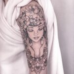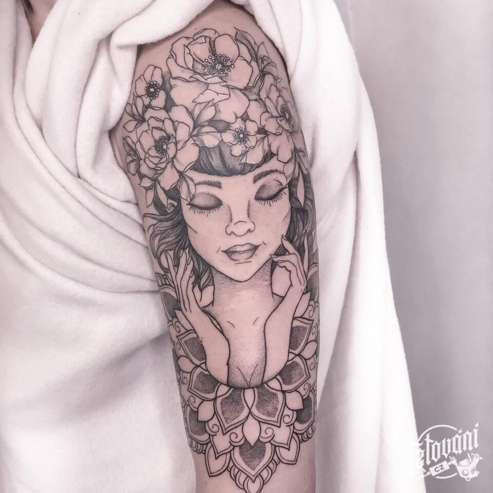 Tetování portrét ženy s květinami na rameni