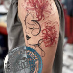 Tetování portrét ženy s květinami ve vlasech na rameni