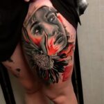 Tetování portrét ženy s květinou na stehně